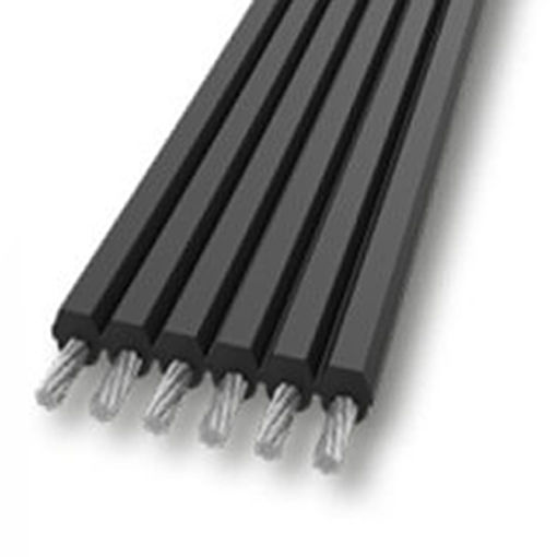 The F33 DP 33-8x2.0 CONTI POLYROPE - 40 kN (EN 81-50) consists of 2.0 mm thick steel ropes, which are embedded in a black polyurethane coating.