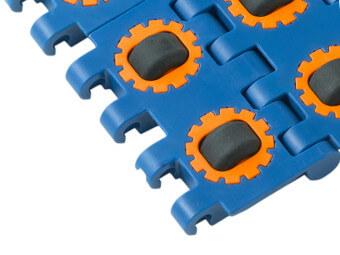 The individual elements corresponding to the shape and spacing of the respective modular belt which have a rubber surface on the upper side. These elements are inserted instead of the usual flat segment and are a permanent part of the belt. In some cases, the rubber elements may be on the entire modular belt. Rubber elements enable the inclined transport objects and prevent them from slipping or falling off the belt. |