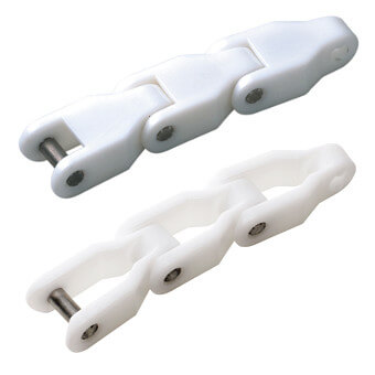 Universal plastic chains are mainly used for handling crates. They show high tensile strength and operating capacity. They are available in open and closed versions. They enable also side flexing running. |