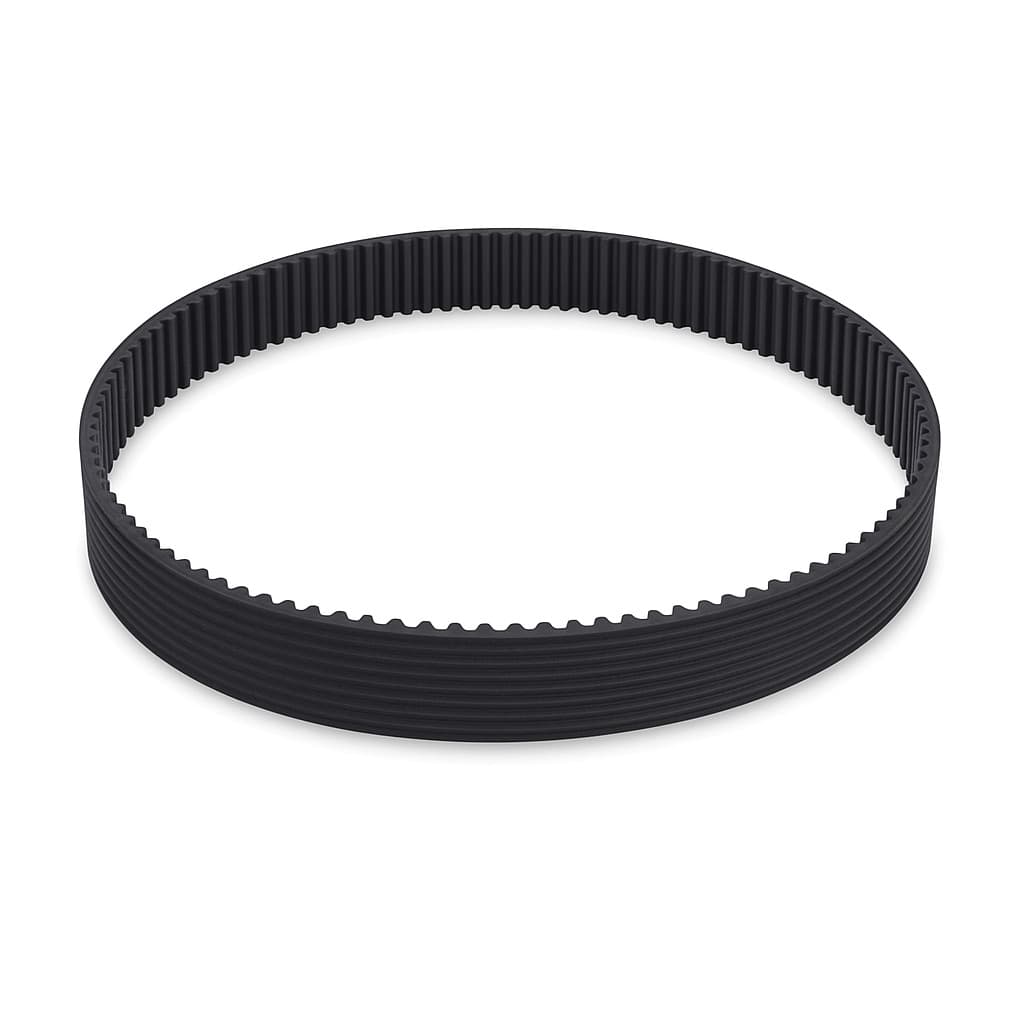 The belt is made of a highly durable synthetic rubber compound with glass-cord tension member and teeth protected by a special polyamide fabric.