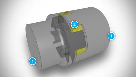 SIT TRASCO are torsionally flexible, puncture-proof shaft couplings with two metal hubs with front claws and a polyurethane element. They transmit torque through pressure-stressed elastic star-shaped buffer which absorbs shock and torsional vibration. This element is oil, chemicals and heat resistant and electrically conductive. The elastic elements are available in different colors according to their hardness.