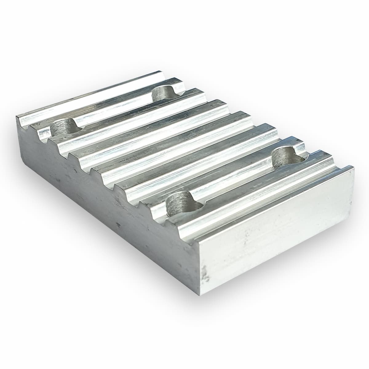 T5-10 for Timing Belt (29 × 41.8 mm) is a fixing plate used to mechanically fasten a linear open-ended timing belt in T5 profile to the base of the machine. It is made of aluminium alloy.