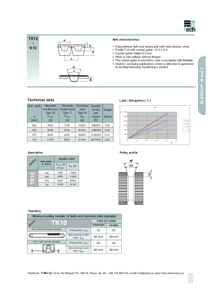 Polyurethane open-ended timing belts with V-guides in TK10 profile are made from thermoplastic polyurethane, which has high dimensional stability and wear resistance, and steel tensile fiber, in special cases aramid or stainless steel.