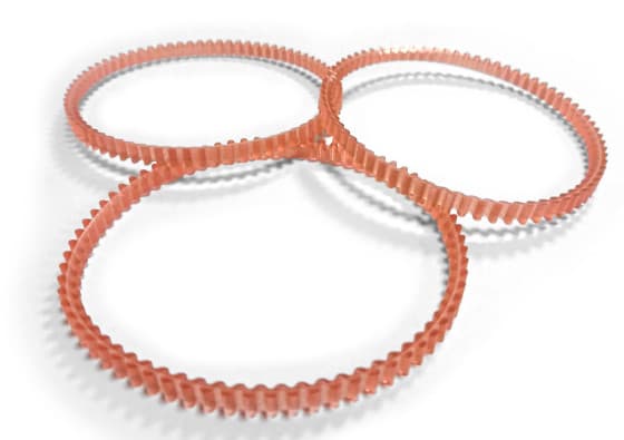 These belts are especially advantageous in applications where oil from processing, gears, or bearings might affect belt properties, in applications that generate ozone during operation, or in applications requiring clean power transmission. The belts are suitable for laboratory and medical devices, food processing devices, as well as vending machines, banknote and coin counters, and ticket machines.